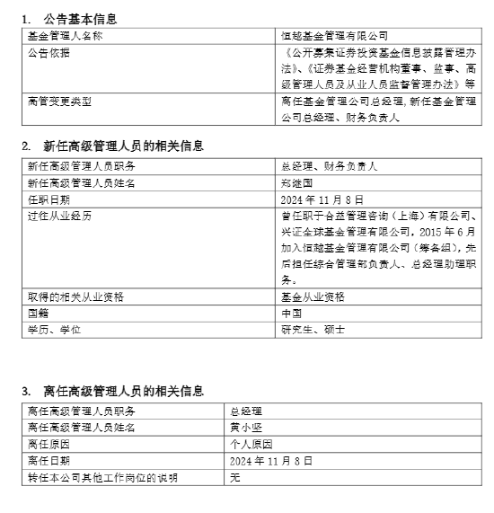 11月11日,恒越基金发布高等惩办东说念主员变更公告,总司理黄小坚因个东说念主原因离任,新任郑继国为总司理、财务负责东说念主开云(中国)Kaiyun·官方网站 - 登录入口,任职日历2024年11月8日。