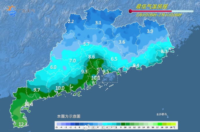 9日,广东大部分市县好天。黎明最低气温:粤北大部市县0~3℃,高海拔山区零下4~零下1℃,珠三角北部和东部、粤东的北部3~5℃,雷州半岛10~13℃,其余市县6~9℃。
